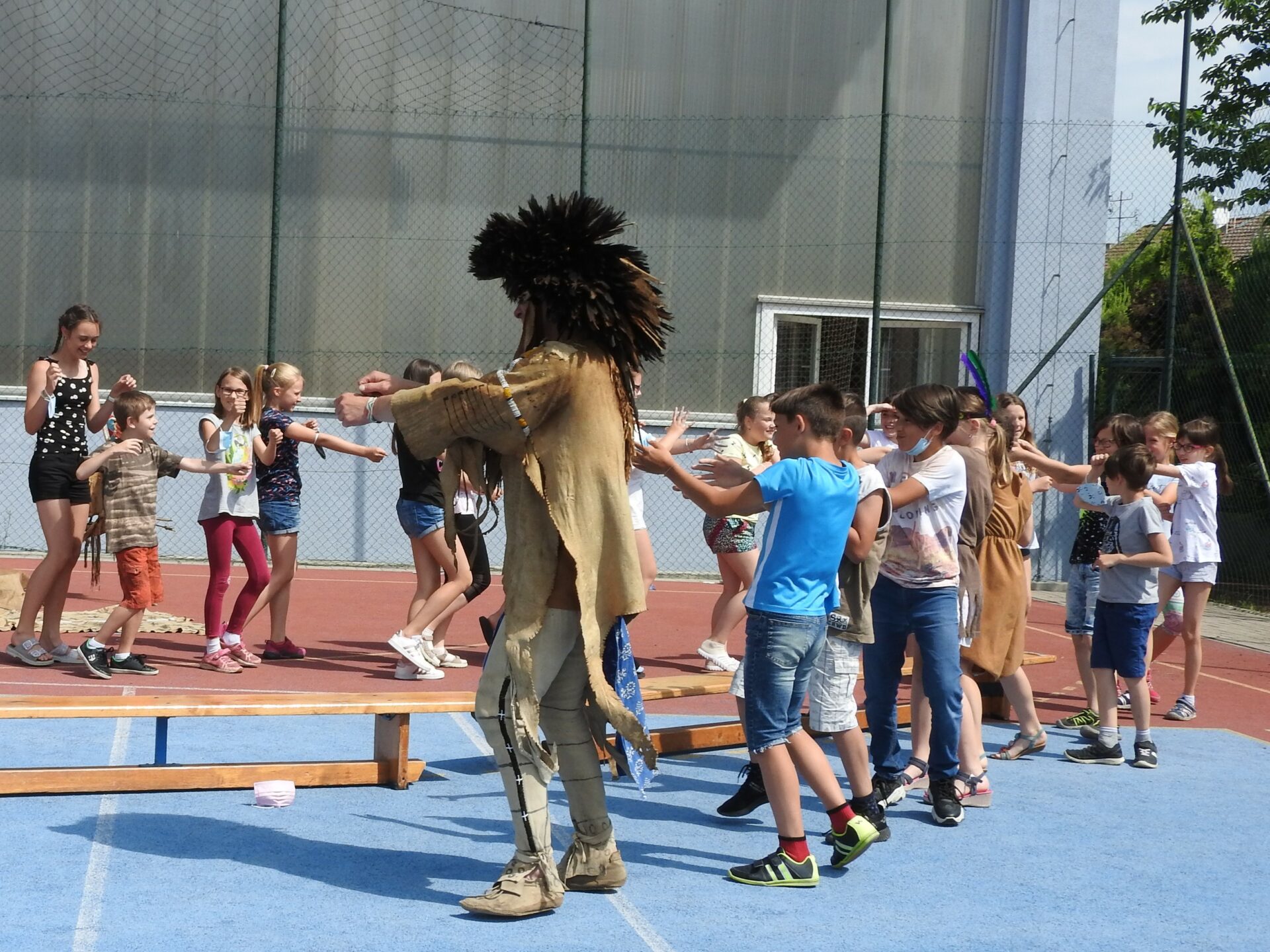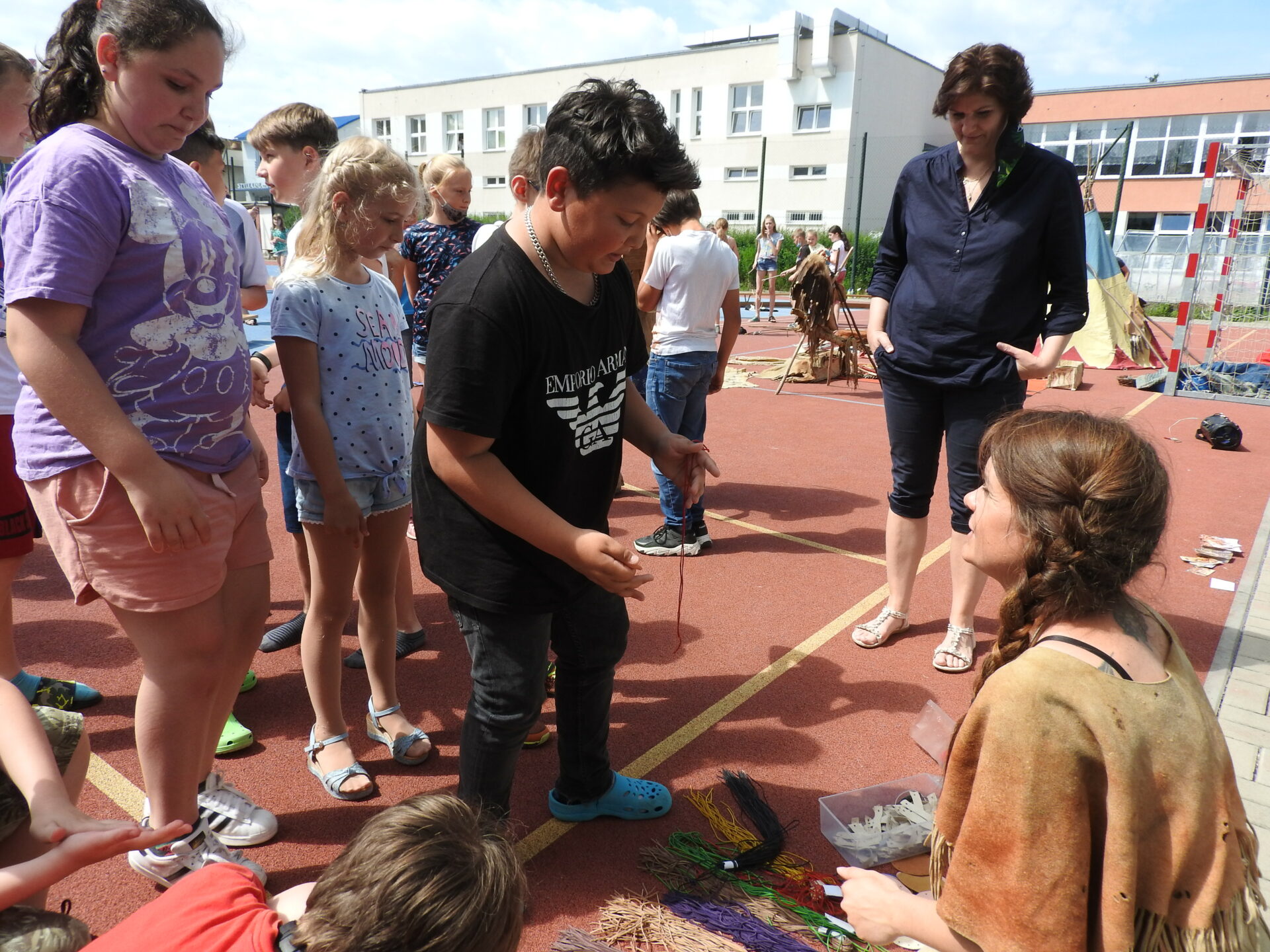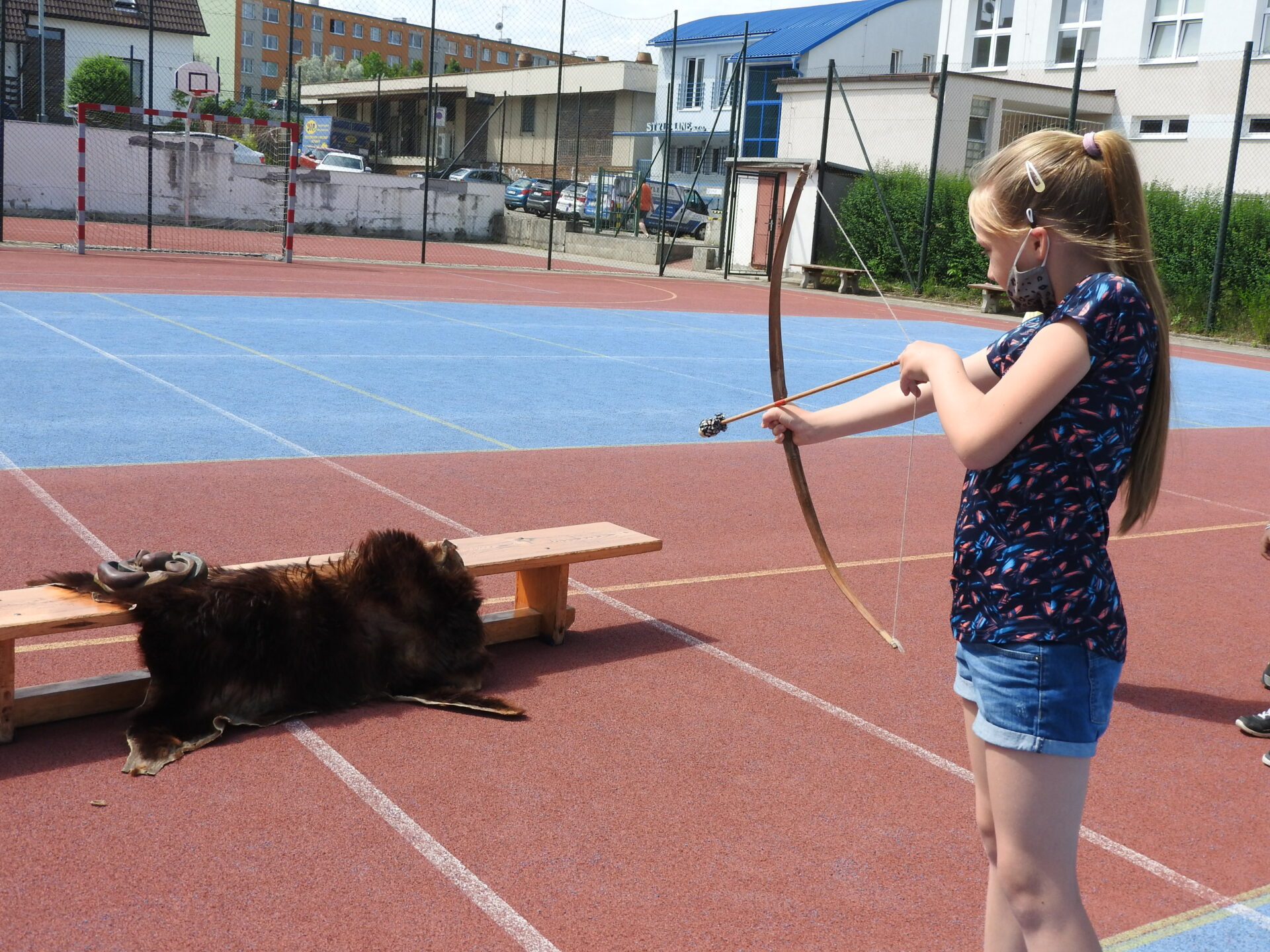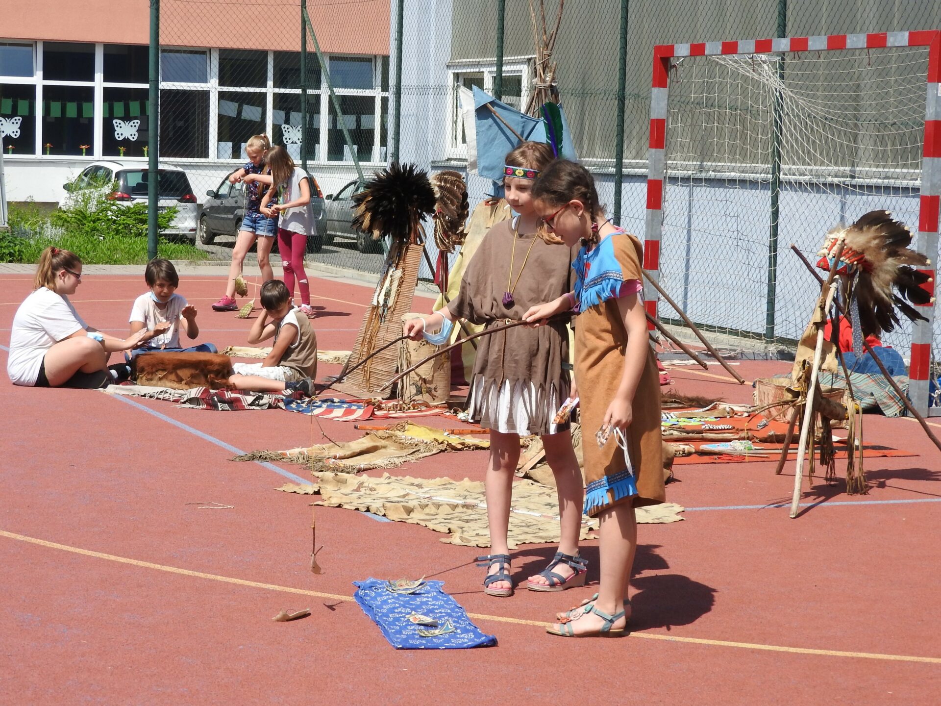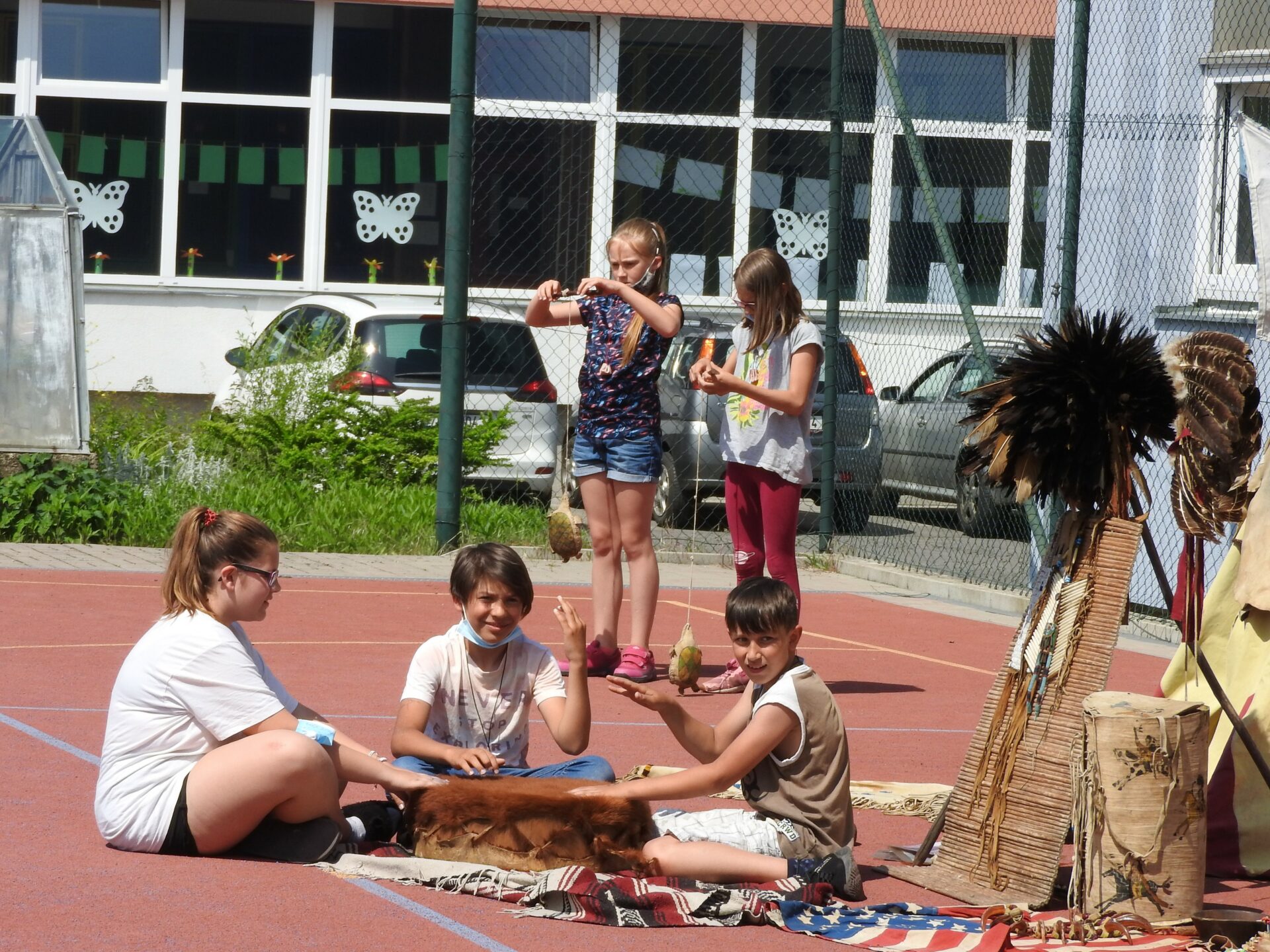 Dnešní den mezi nás zavítala indiánská rodinka až z daleké vesničky jménem Rosehill, ze světa prérijních indiánů. Její členové nás seznámili, jak žili původní obyvatelé Severní Ameriky, zejména prérijní idiáni z kmene Siouxů, Šajenů, Arapahů… Dozvěděli jsme se mnoho zajímavého z jejich života, mohli jsme si zastřílet z luku, poslechli si indiánskou hudbu, zahráli si různé hry a nakonec jsme si vyrobili náramek, náhrdelník nebo měšec z kůže na krk. Prožili jsme další prima den ve škole.